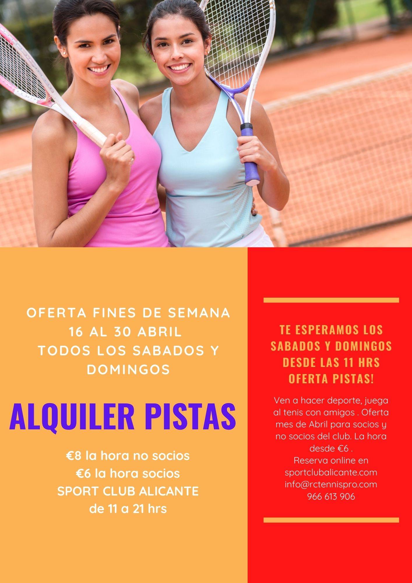 Promo alquiler pistas TENIS 12/04/2022 Nueva promo alquiler de pistas en Abril Fines de semana solamente del 16-30 Abril en los horarios de 11h a 21h PRECIOS: Socios 6€/h No socios 8€/h