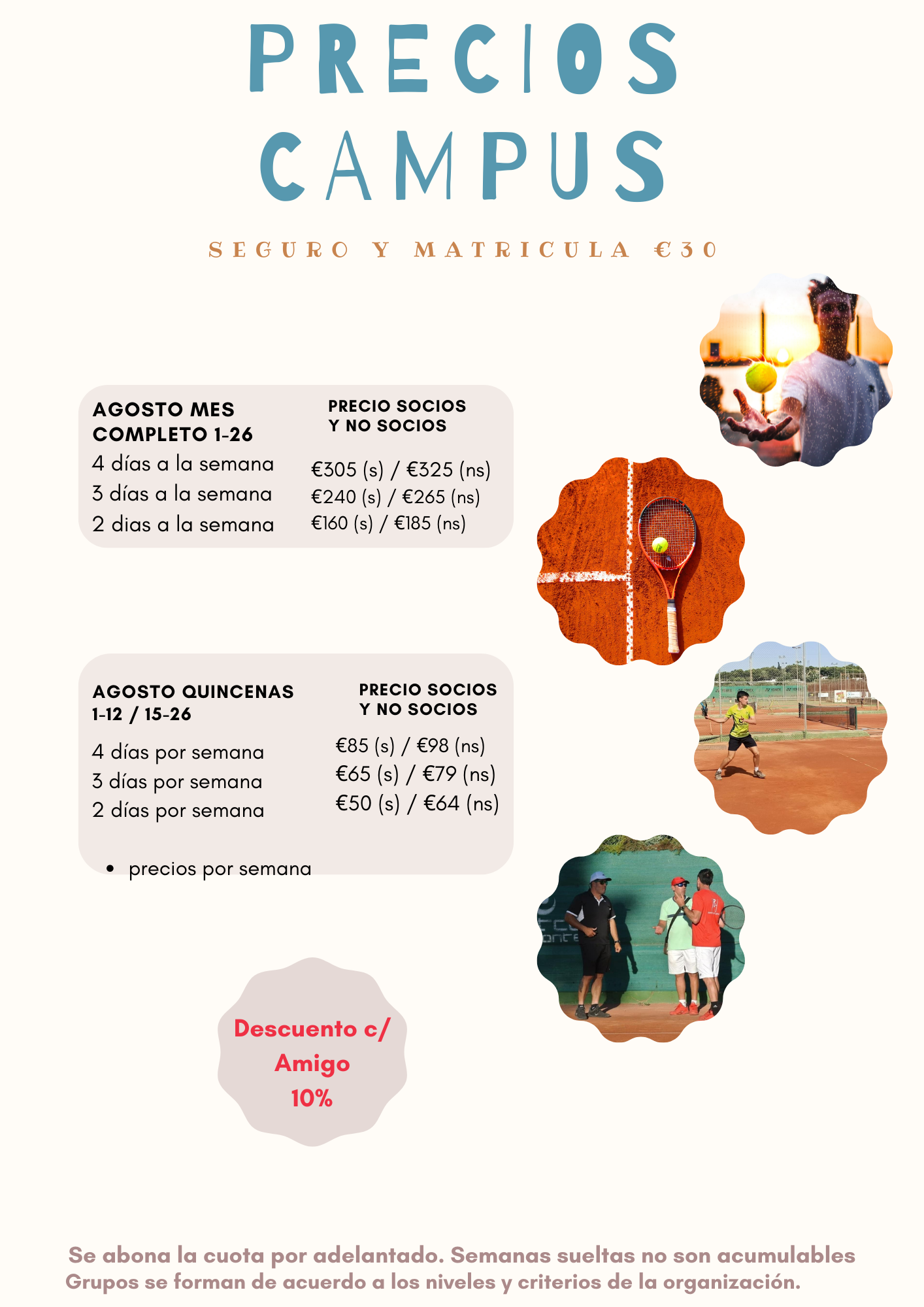 TENIS PARA ADULTOS EN AGOSTO 29/07/2022 RC TENNIS PRO ha creado las clases para adultos y también campus del 1 al 26 de Agosto. Estupendos precios para que sigas practicando tu deporte favorito. Infórmate: 633 343 173 www.rctennispro.com