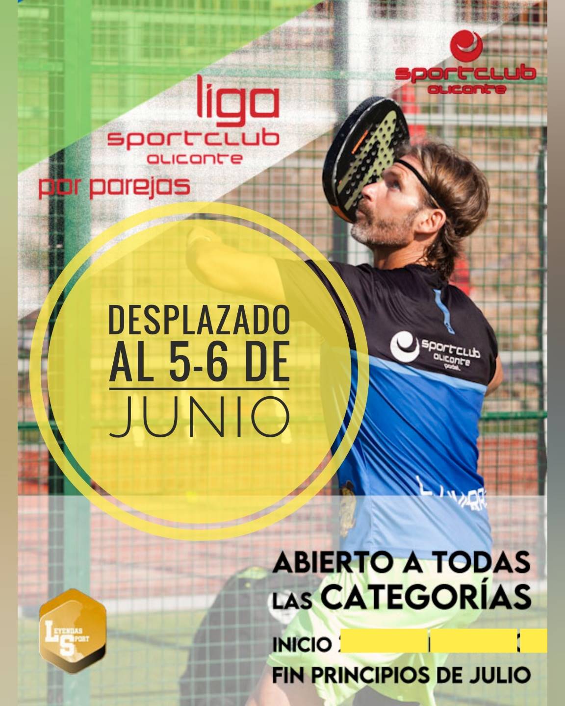 Torneo Pádel DESPLAZADO 27/05/2021 El torneo de pádel Liga Sport Club Alicante se desplaza al próximo fin de semana 5 - 6 de Junio, por ampliación de inscripciones. Animarós a participar en esta nueva liga. Más información: https://sportclubalicante.matchpoint.com.es/Pages/12-CAMPEONATOS